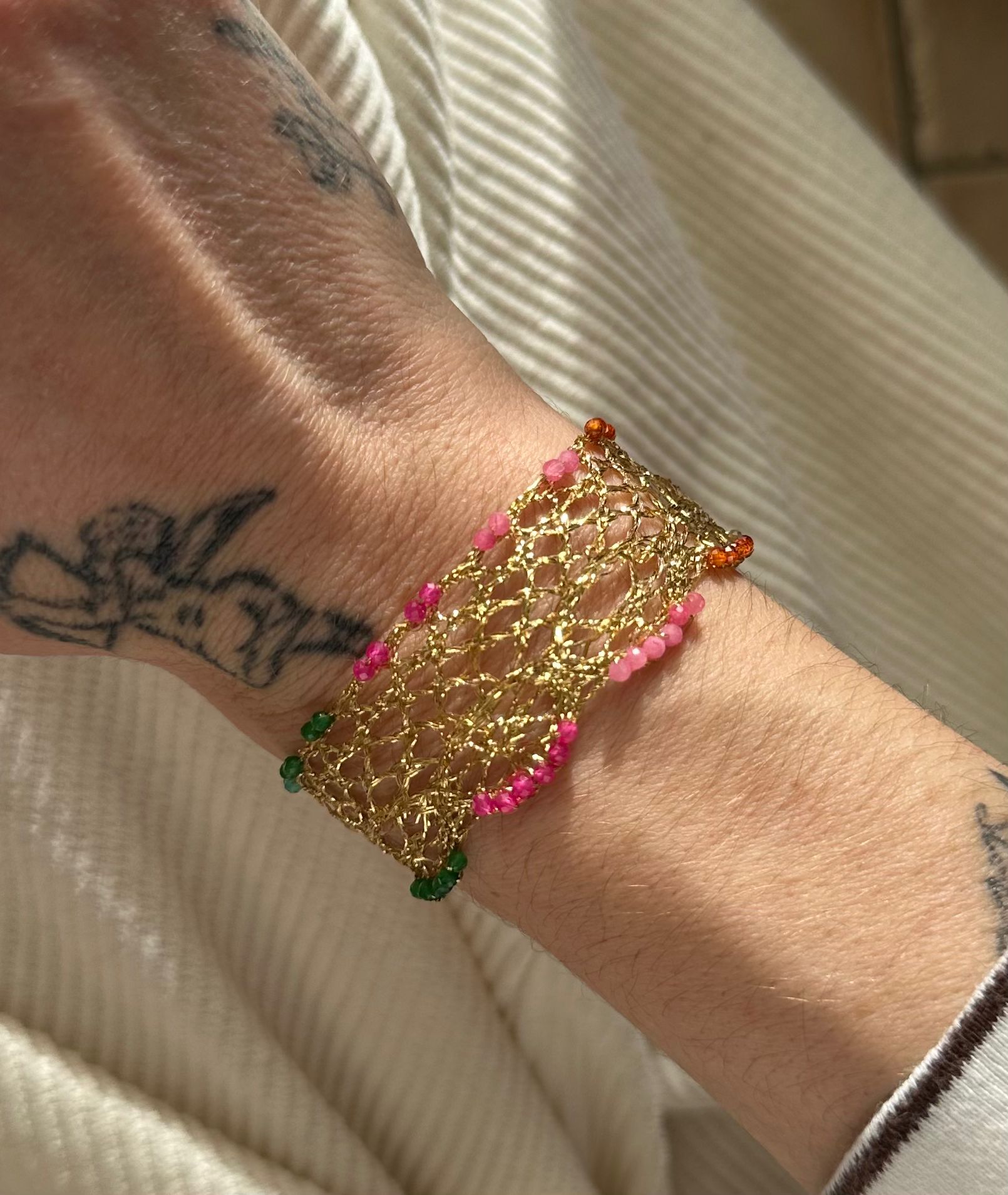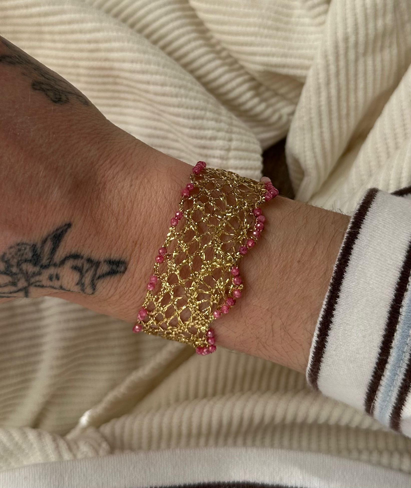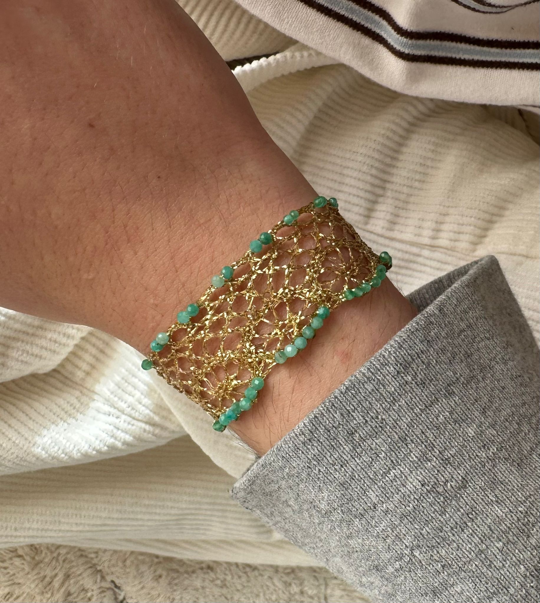 Bracelet tissage de fils de lurex façon dentelle