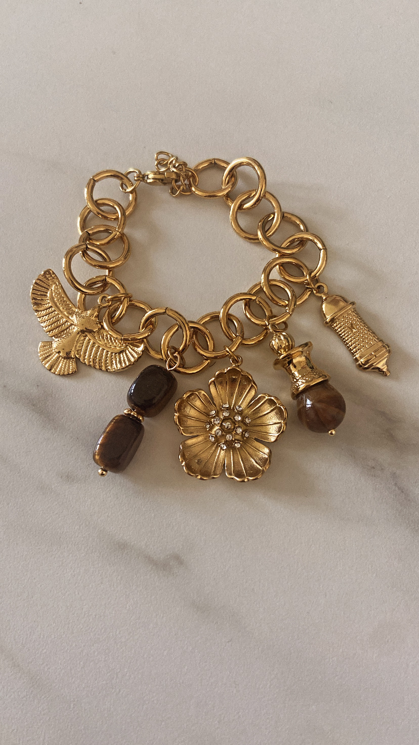 Bracelet breloques phénix, fleur, amulette, perles oeil de tigre