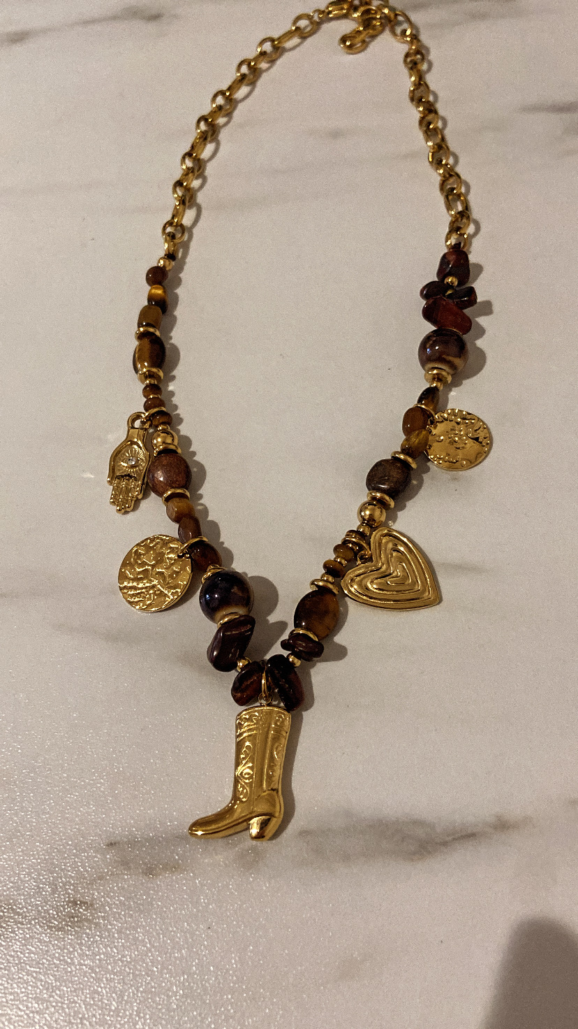 Collier chaine en acier inoxydable et perles en oeil de tigre