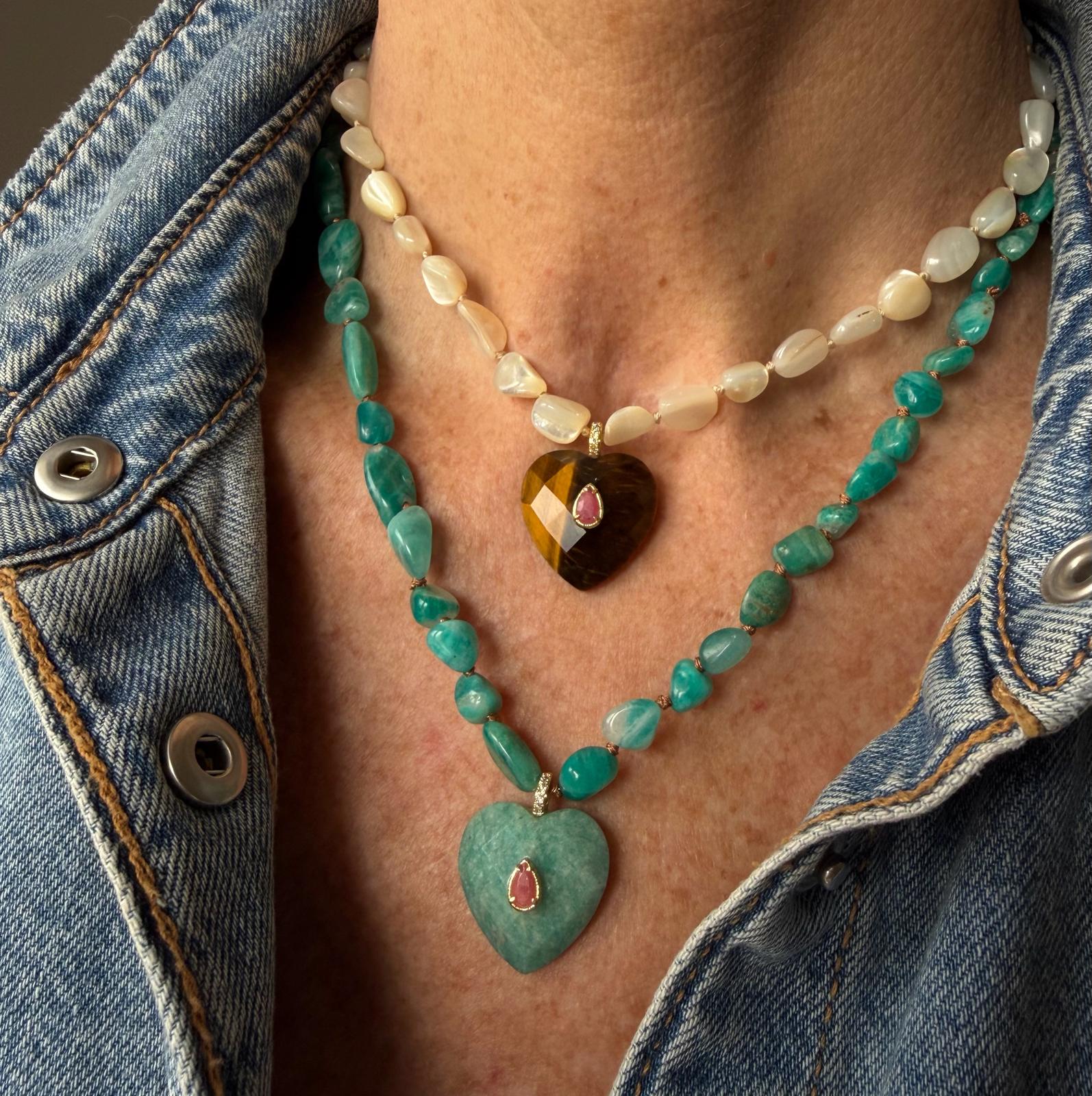 Collier en perles semi precieuses et pendentif coeur en pierre semi précieuse