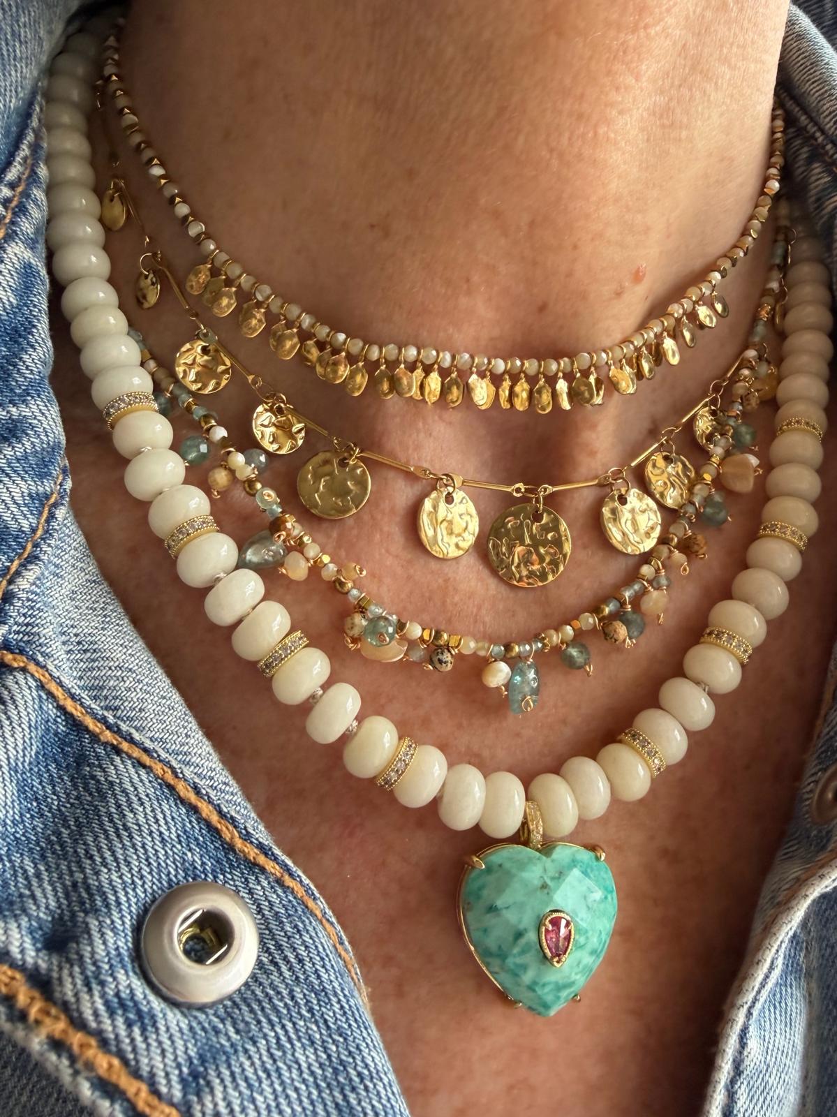 Composition de plusieurs colliers en acier inoxydable, perles semi précieuses, pierres semi précieuses.