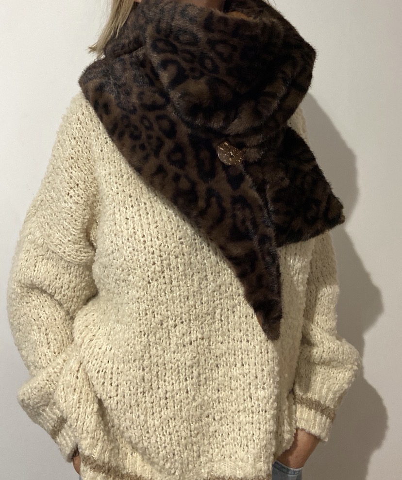 on s’entoure le cou et on ferme l’étole avec un bouton en bois