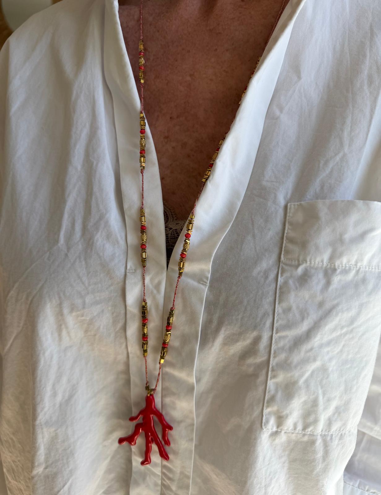Sautoir cordon, perles en acier inoxydable, pendentif en forme de corail